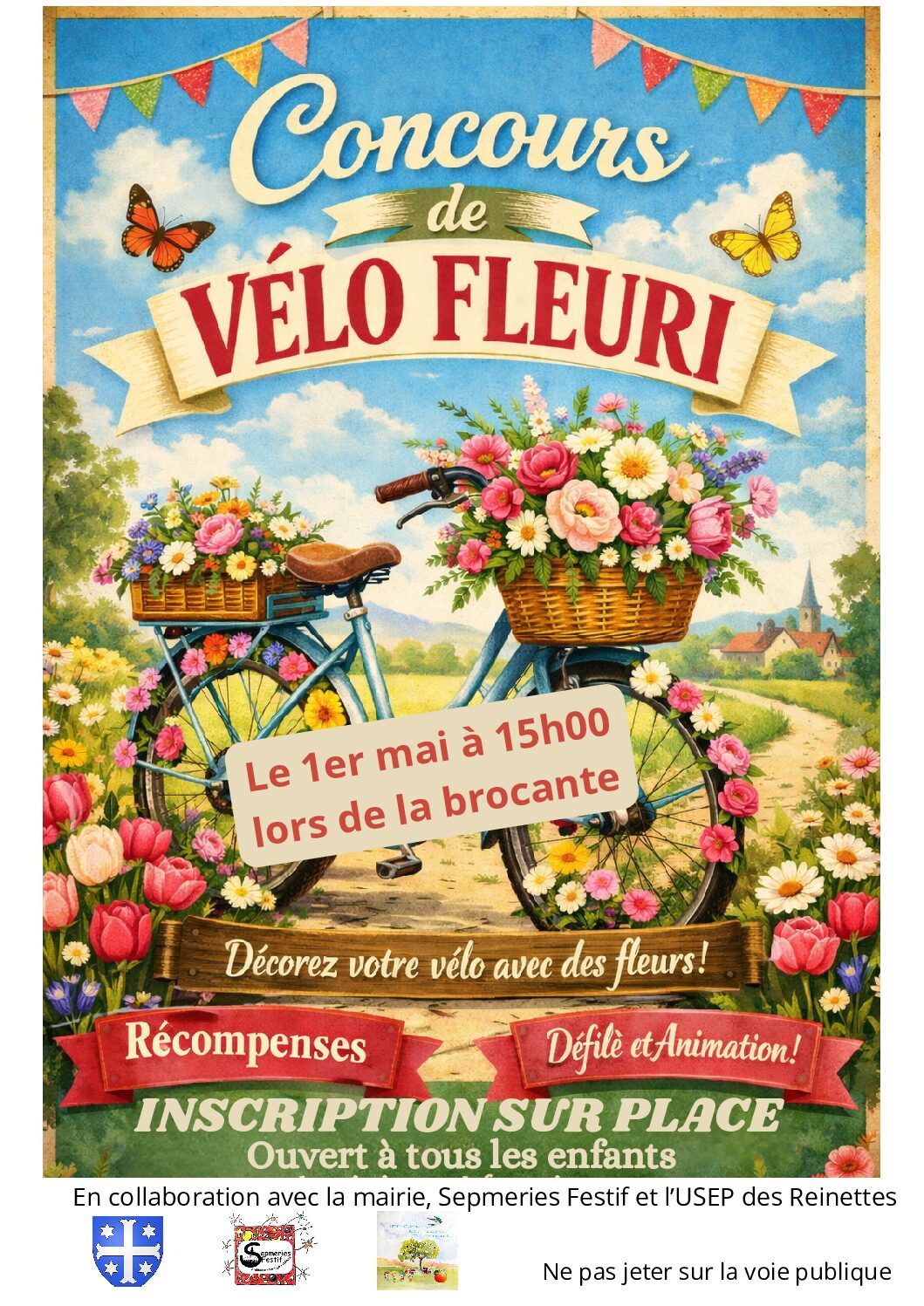 Petits cyclistes, préparez vos plus belles décorations ! Le 1er mai à 15h00, un grand concours de vélo fleuri et un défilé seront organisés au cœur de la brocante.